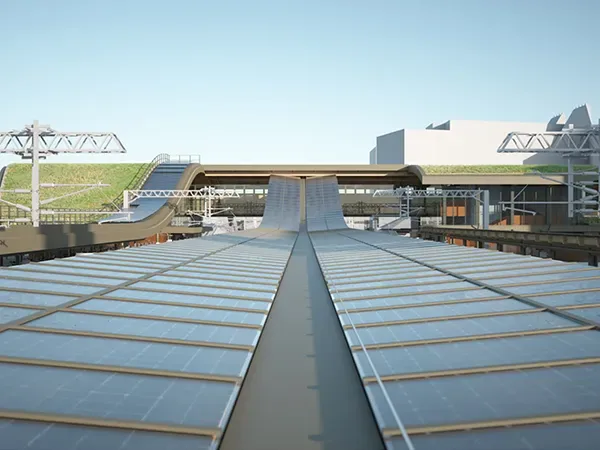 La stazione sarà dotata di pannelli fotovoltaici, una copertura verde e blu per la gestione dell'acqua piovana e habitat per la fauna selvatica, in linea con gli obiettivi di biodiversità ed emissioni zero della città. Il design accessibile della stazione ridurrà il traffico locale di oltre 1100 veicoli al giorno e promuoverà opzioni sostenibili per i pendolari, migliorando la qualità dell'aria e della vita nell'intera regione.